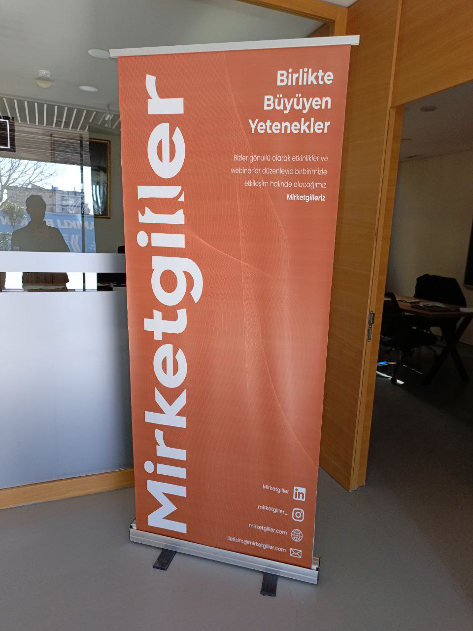 Slogan ve renk temasına uygun roll-up tasarımları hazırladım; mockup kullanarak baskı sürecini optimize ettim.