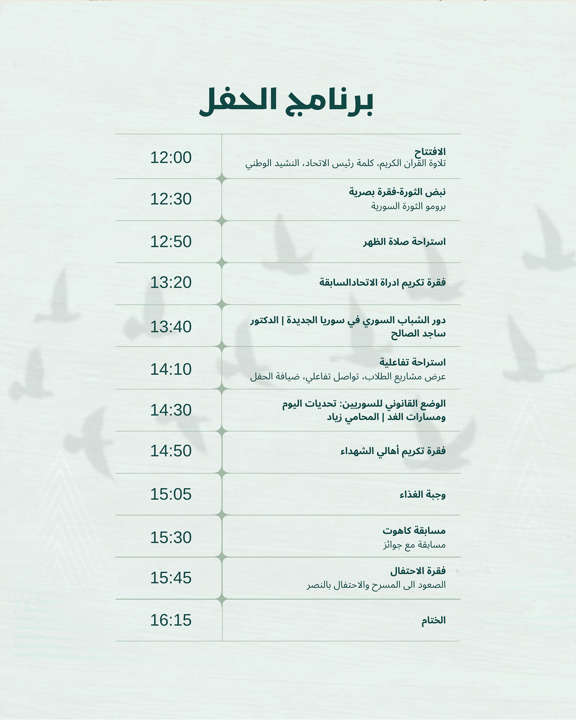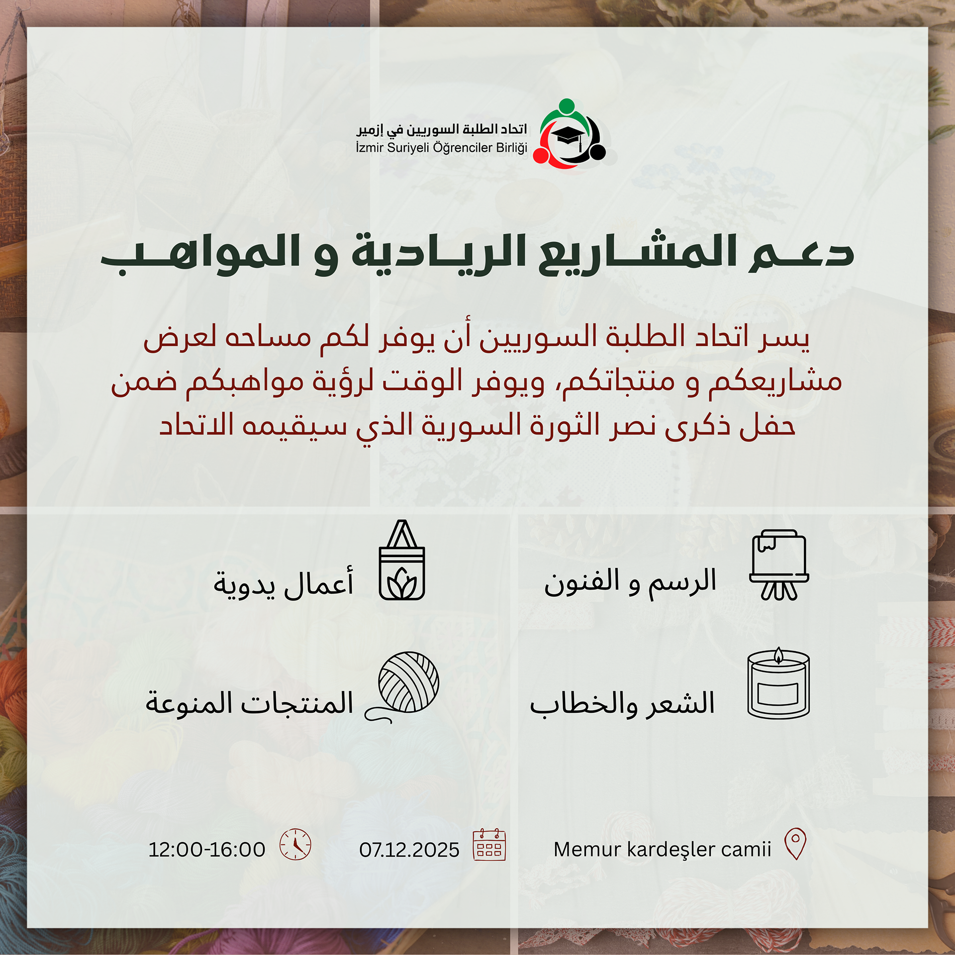 Burada, Kasım ayının başında suriyeli birliği ile çalışmaya başladığımdan bu yana hazırladığım 9’dan fazla tasarım yer almaktadır. Bu çalışmalar, birliğin projeleri ve etkinlikleri için hazırlanmış tanıtım ve reklam tasarımlarıdır; tasarımlarda mesajın netliğine ve görsel kimliğe uyum sağlanmıştır.